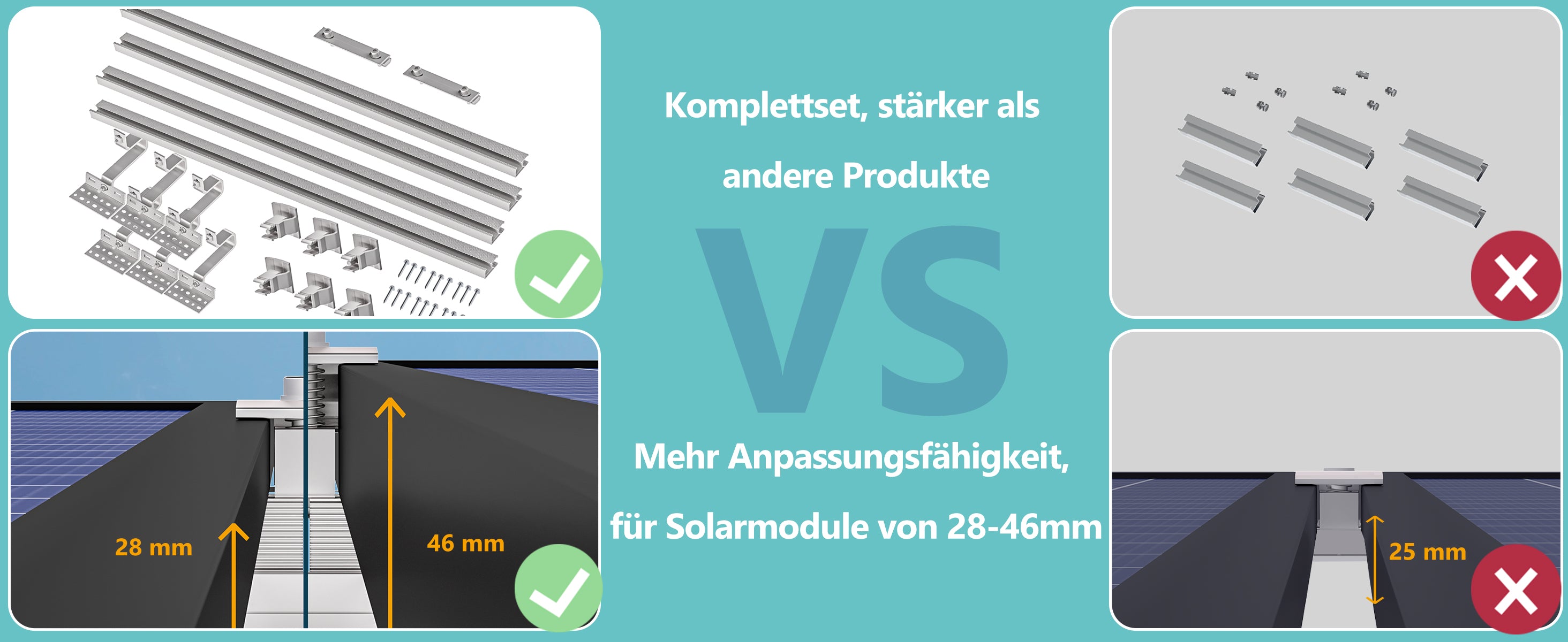 ✅Die Endklemmen sind kompatibel mit Solarmodulen, deren Stärke zwischen 28 und 46 mm liegt, was eine flexible Installation ermöglicht. Je nach Bedarf lassen sich die Klemmen individuell einstellen, um die Stabilität und sichere Befestigung der Halterung zu gewährleisten. Dank der beiliegenden Montageanleitung gelingt die Installation schnell und unkompliziert.