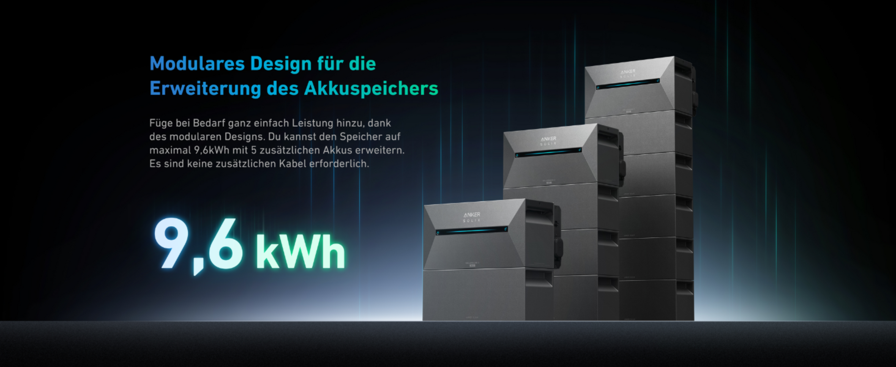 Füge bei Bedarf ganz einfach Leistung hinzu, dankdes modularen Designs.Du kannst den Speicher aufmaximal 9,6kWh mit 5 zusätzlichen Akkus erweitern. Es sind keine zusätzlichen Kabel erforderlich.