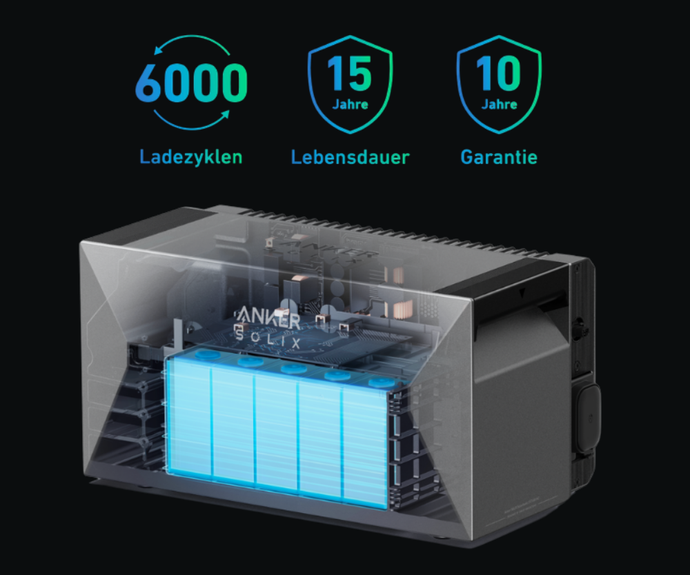 Unsere fortschrittlichen LiFeP04-Akkus halten doppelt so lange wie herkömmliche LiFeP04-Akkus mit 3.000 Zyklen und sogar sechsmal längerals typische ternäre Lithiumbatterien. Mit der Solarbank 2 AC kannst du dich darauf verlassen,dass sie für die Zukunft gebaut ist.